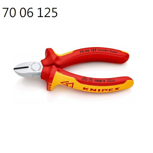 Knipex 70 06 125 Diagonal Cutter VDE 125 mm Knipex 70 06 140 Diagonal Cutter VDE 140 mm Knipex 70 06 160 Diagonal Cutter VDE 160 mm Knipex 70 06 180 Diagonal Cutter VDE 180 mm Knipex 70 26 160 Diagonal Cutter VDE 160 mm • the indispensable diagonal cutter for all-round use • high quality material and precise workmanship for long service life • precision cutting edges for soft and hard wire • clean cutting of thin copper wires, also at the cutting-edge tips • cutting edges additionally induction hardened, cutting edge hardness approx. 62 HRC • narrow head style for use in confined areas • Vanadium electric steel; forged, oil-hardened Pliers: chrome plated Handles: insulated with multi-component grips, VDE-tested